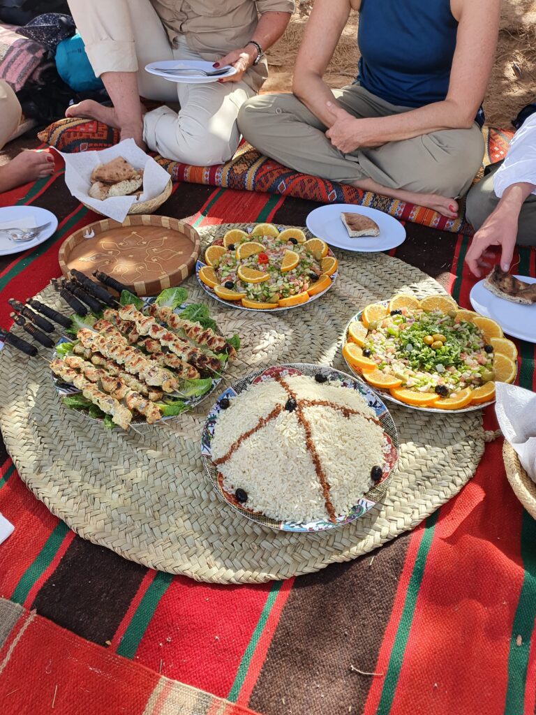 Chaque journée alterne marche dans le désert, séances de yoga et de personal training encadrées par Marie, et immersion dans la culture nomade. Visites de sites ancestraux, rencontres avec les habitants, gastronomie locale autour d’un thé à la menthe.